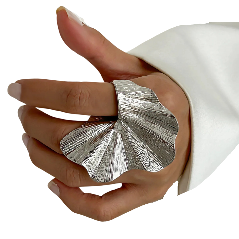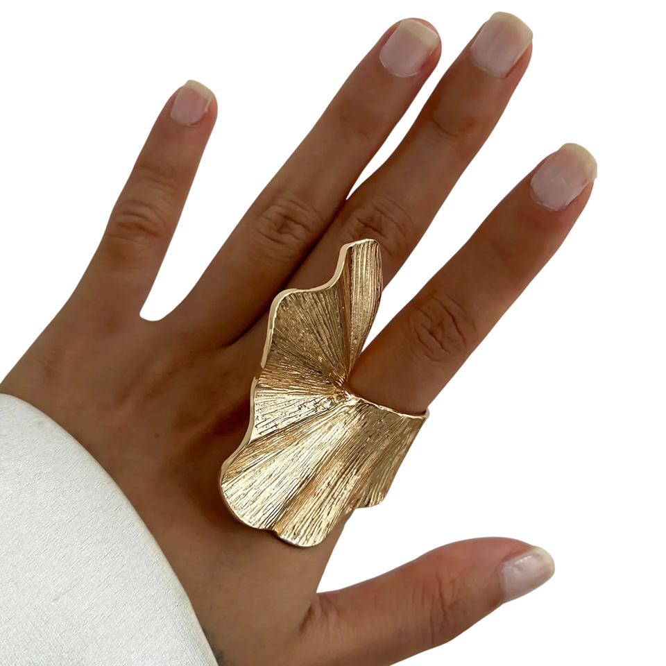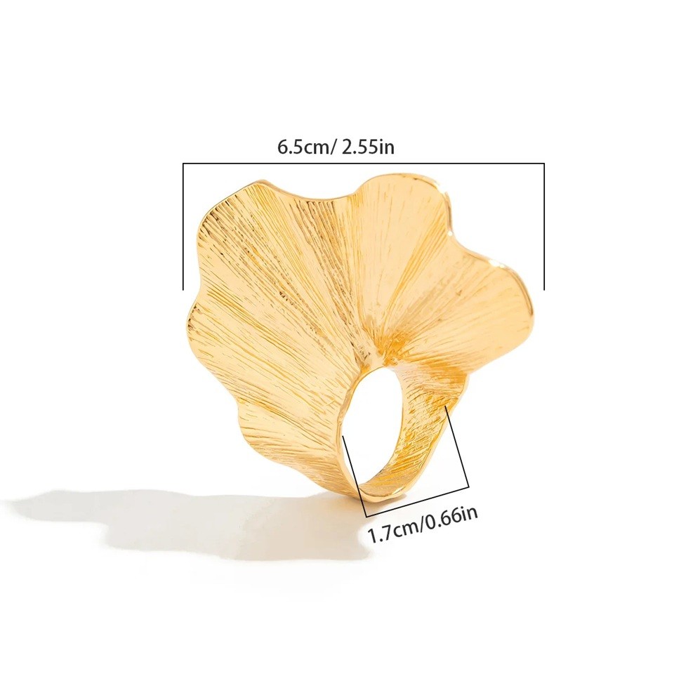 Stilren och iögonfallande ring inspirerad av ginkgobladen ger elegans till varje outfit. Lätt, bekväm och lämplig för vardagsbruk såväl som festliga tillfällen. Fullständig beskrivning