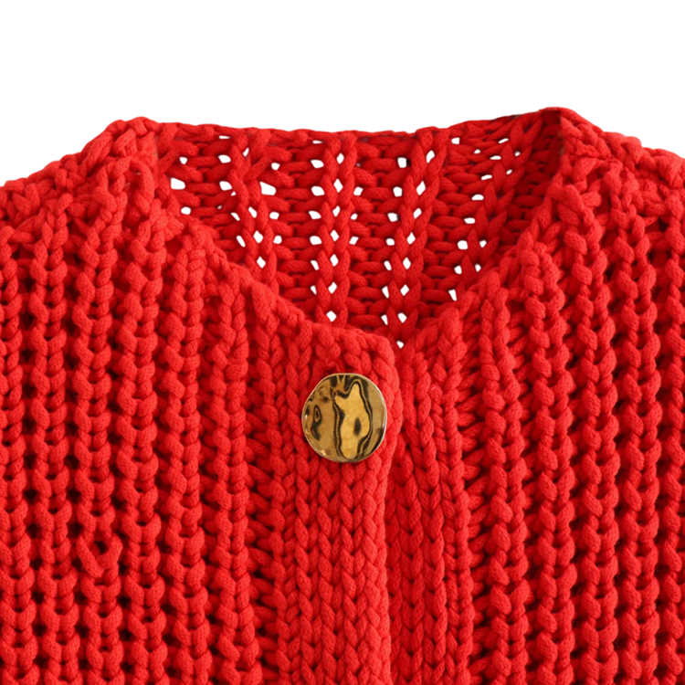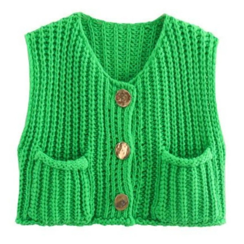 Stilfull damstickad väst med V-ringning och fickor. Knäppning med knappar, mjukt polyester material och tidlös design för alla tillfällen. Fullständig beskrivning