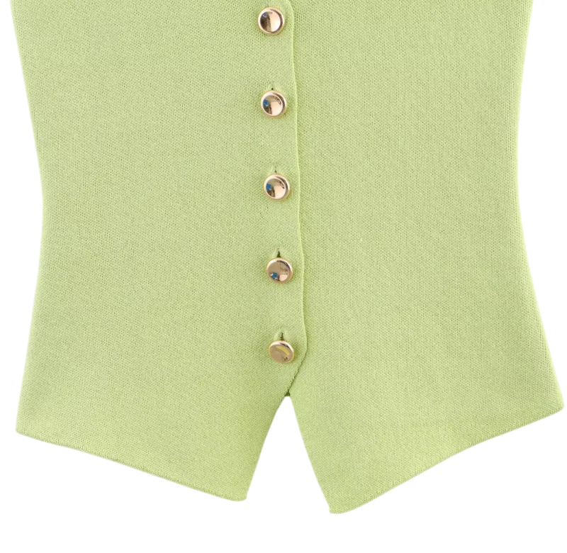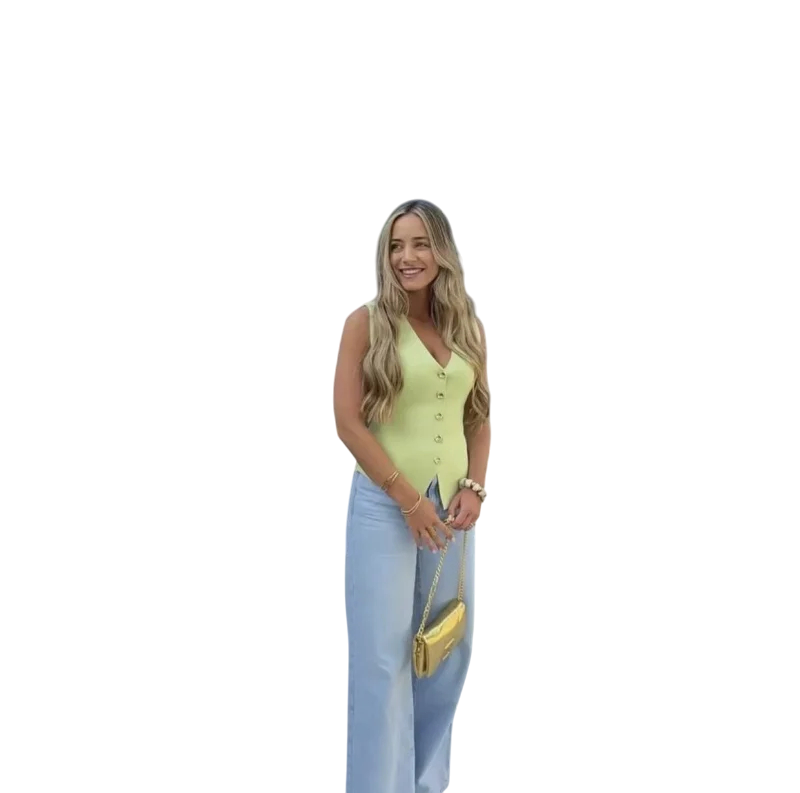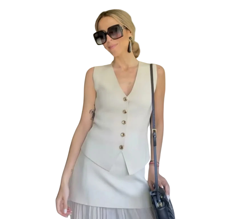 Stilig dams väst med V-urringning och knapplåsning. En utmärkt accessoar för både vardagliga och formella outfits, tillgänglig i olika färger. Fullständig beskrivning