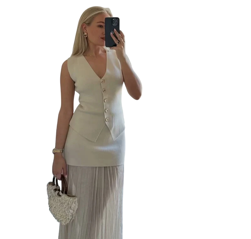 Västen kommer att bli en favorit i din garderob tack vare sin universella stil och komfort. Den framhäver kroppen, ger rörelsefrihet och ser samtidigt elegant ut. Du kan enkelt kombinera den med jeans, kjol eller byxor och skapa en outfit som passar för arbete, staden eller sociala evenemang. Om du letar efter en bit som förenar komfort, stil och elegans, är denna väst det rätta valet.