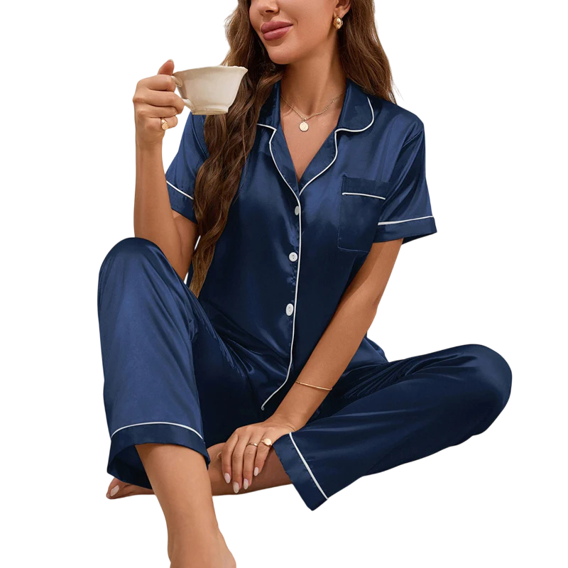 Elegant dampyjamas av mjuk polyester och elastan. Bekväm skjorta med ficka och långa byxor för lugn sömn och avkoppling hemma. Fullständig beskrivning