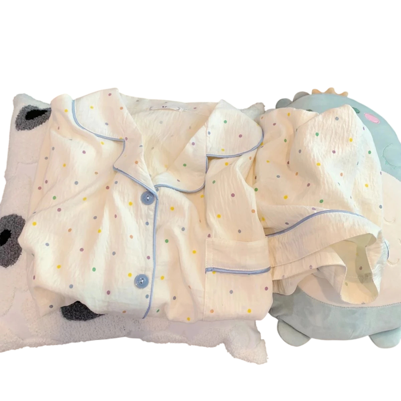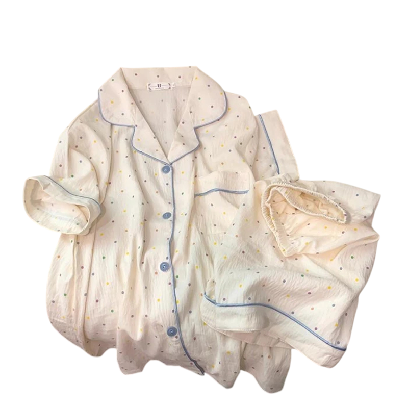 Detta vackra pyjamasset är det perfekta valet för kvinnor som vill kombinera komfort och elegans. Lätt och mjuk polyester säkerställer maximal komfort även vid högre temperaturer. Knapp-up t-shirten med krage ser stilfull ut och möjliggör enkel påklädning, medan shortsen med elastisk midja ger frihet och komfort vid rörelse. Den vita prickiga mönstret ger outfiten en mjukhet och feminin charm. Detta pyjamasset är det perfekta valet för dagligt bruk eller som smakfull present för kvinnor som värdesätter komfort och stil i ett.
