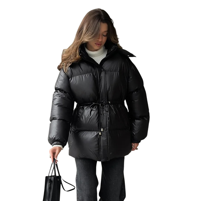 Varm dam vinterjacka med huva, dragkedja och knappar, praktiska fickor och snörning i midjan för komfort och anpassning till kroppen. Fullständig beskrivning