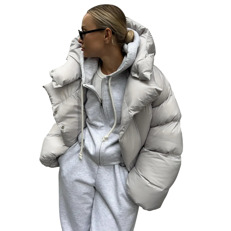 Varm dam vinterjacka med huva, knäppning, krage och fickor. Stilig, bekväm och idealisk för vardagsbruk under vinterdagar. Fullständig beskrivning