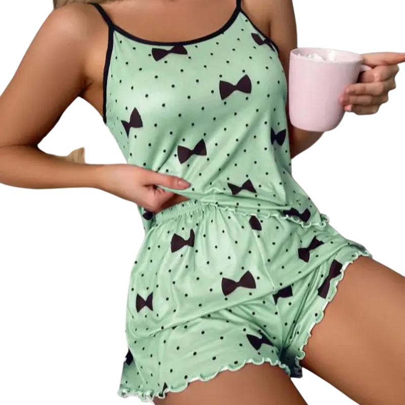Elegant dampyjamas med söt rosett-mönster, perfekt för sommarkvällar. Lätt och andningsbart polyester säkerställer en bekväm sömn. Fullständig beskrivning