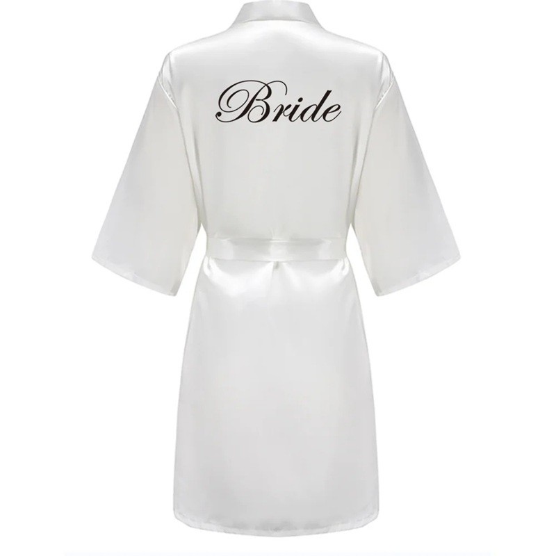 Lätt dambröllopskappa i konstsilke med texten BRIDE och knytning i midjan. Elegant och bekväm tillbehör för bruden under förberedelserna och fotograferingen. Fullständig beskrivning