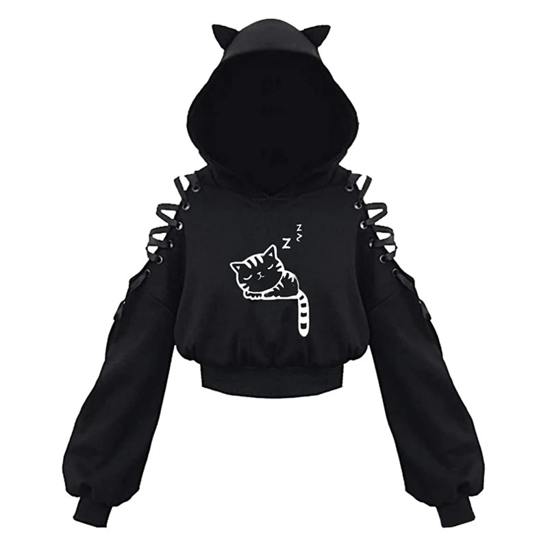 Damsk hoodie med kattöron Svart hoodie med kattmönster och snörning på axlarna Bekväm bomulls-polyester överdel