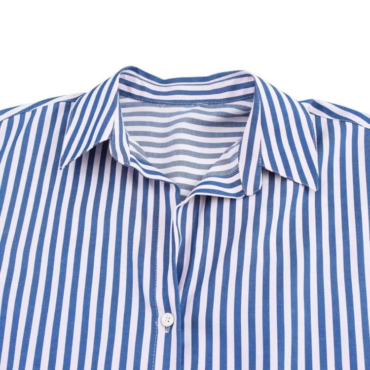 Denne damsk randig lös skjorta med krage och lång ärm är den perfekta kombinationen av stil, komfort och lätthet. Tillverkad av kvalitativ och andningsbar polyester, ger den en behaglig känsla vid användning hela dagen. Dess lösa passform ger ett modernt utseende och säkerställer rörelsefrihet, medan klassisk knäppning med knappar och elegant krage framhäver en formell men ändå avslappnad stil. Det randiga mönstret ger en tidlös och elegant känsla, vilket gör att skjortan passar utmärkt för kontoret, möten och vardagsbruk. Den finns i flera färgvarianter som kompletterar varje outfit.