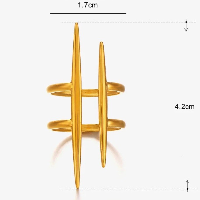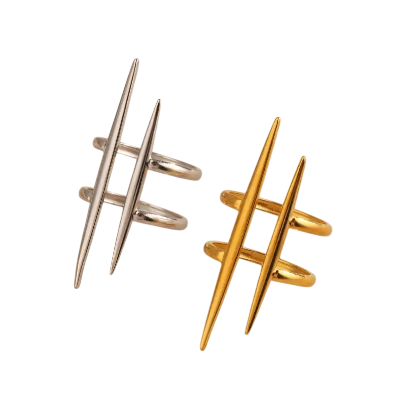 Ringen fångar uppmärksamhet med sin moderna design som kombinerar modern dubbel linje och stiligt utseende. Tack vare den precisa bearbetningen är ringen behaglig att bära och orsakar ingen obehag även vid längre användning. Den är lämplig som modeaccessoar, men också som en originell present till en kvinna som uppskattar stil och kvalitet. Den öppna designen möjliggör enkel påtagning och justering av storleken utan behov av professionell hjälp.