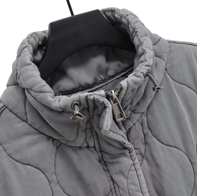 Stilren dam vinterväst med snörning i midjan och fickor. Bekväm passform, knäppning med knappar och elegant grå design i slitstark polyester. Fullständig beskrivning