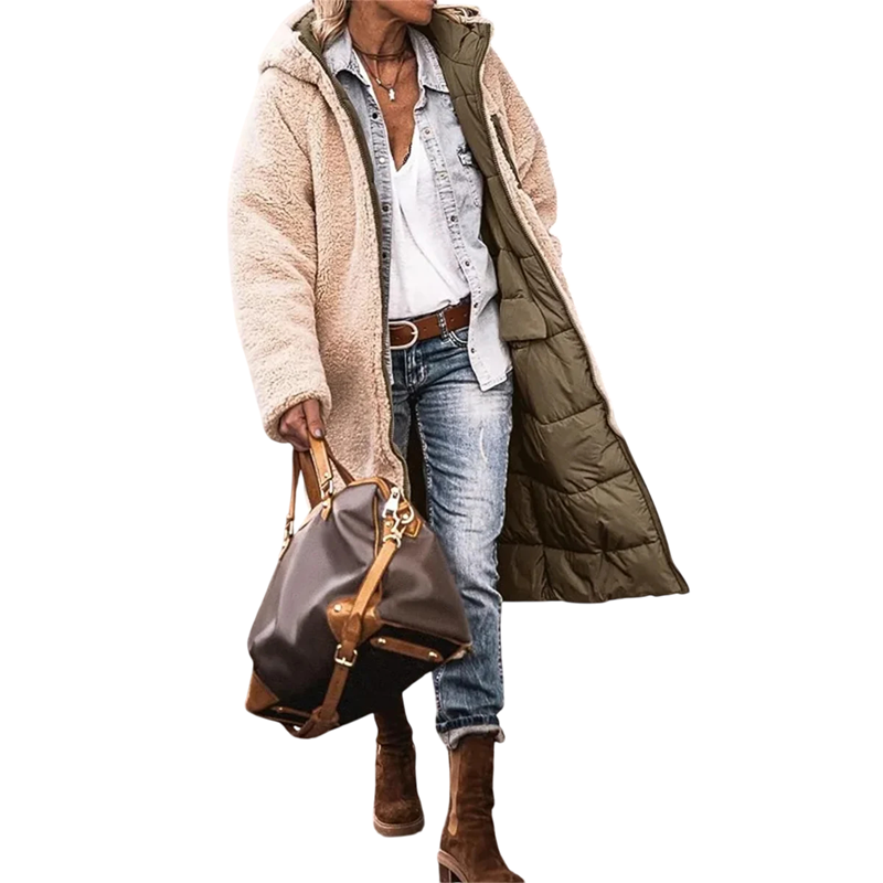 Damsk vinterjacka Vändbar med fuskpäls Dragkedja Huva Polyester nylon Varm och skön jacka 2i1 Stilig vinterkappa för kalla perioder