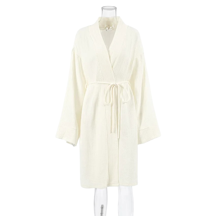 Damskåpa beige färg Mjuk bomullskåpa Knut runt midjan Bekväm hemmakåpa i andningsbar bomull Lätt elegant damkåpa