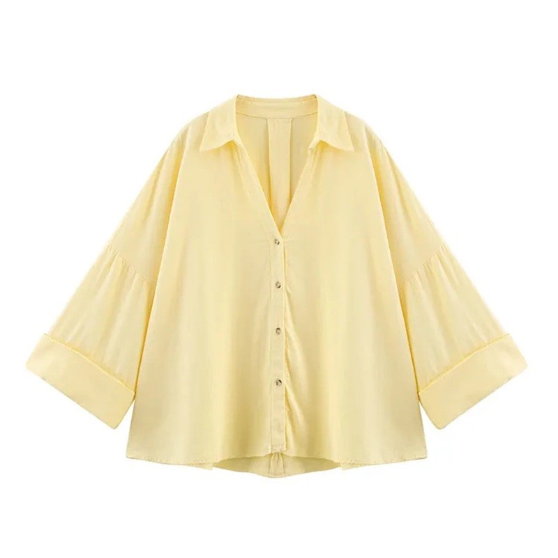 Damskjorta i lätt linne med krage, vida ärmar, asymmetrisk fåll, knappknäppning, luftig blus i naturmaterial