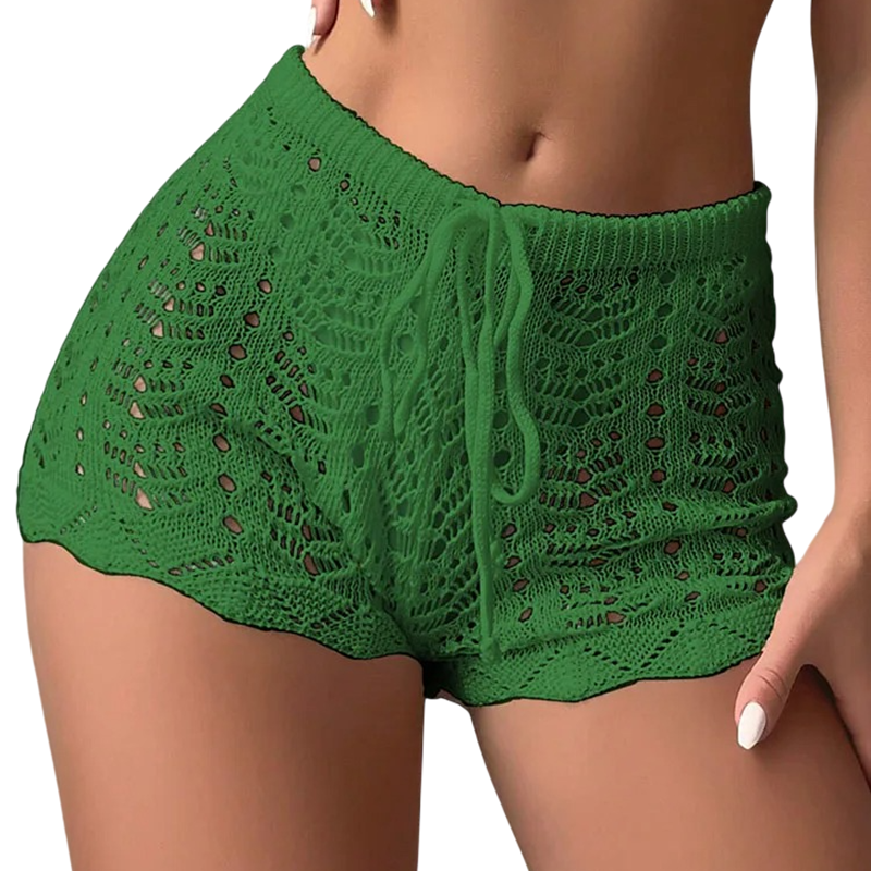 Lätta virkade shorts med hög midja och snörning, luftiga och stiliga, perfekta för sommaren, stranden och vardagsbruk. Fullständig beskrivning
