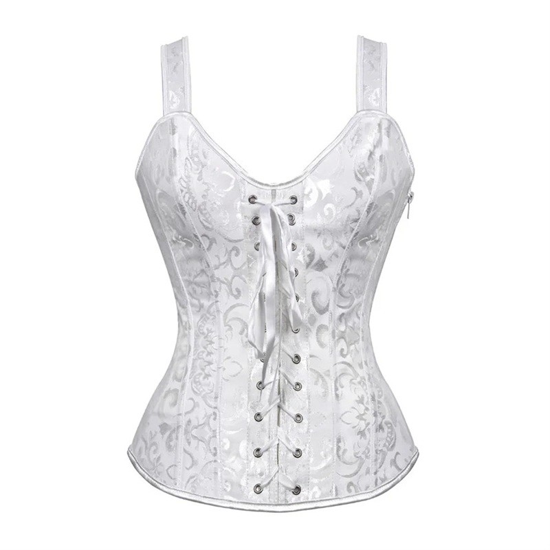 Korsetten är tillverkad av en kvalitetsblandning av polyester och spandex, vilket gör den elastisk, anpassningsbar och behaglig mot huden. Materialet anpassar sig lätt efter kroppens form och hjälper till att framhäva silhuetten utan att begränsa rörelsefriheten. Spagettibanden ger nödvändigt stöd och säkerställer stabilitet under användning. Denna modell är lämplig inte bara som en del av underkläder, utan också som en modeaccessoar under en kavaj, skjorta eller lätt topp.