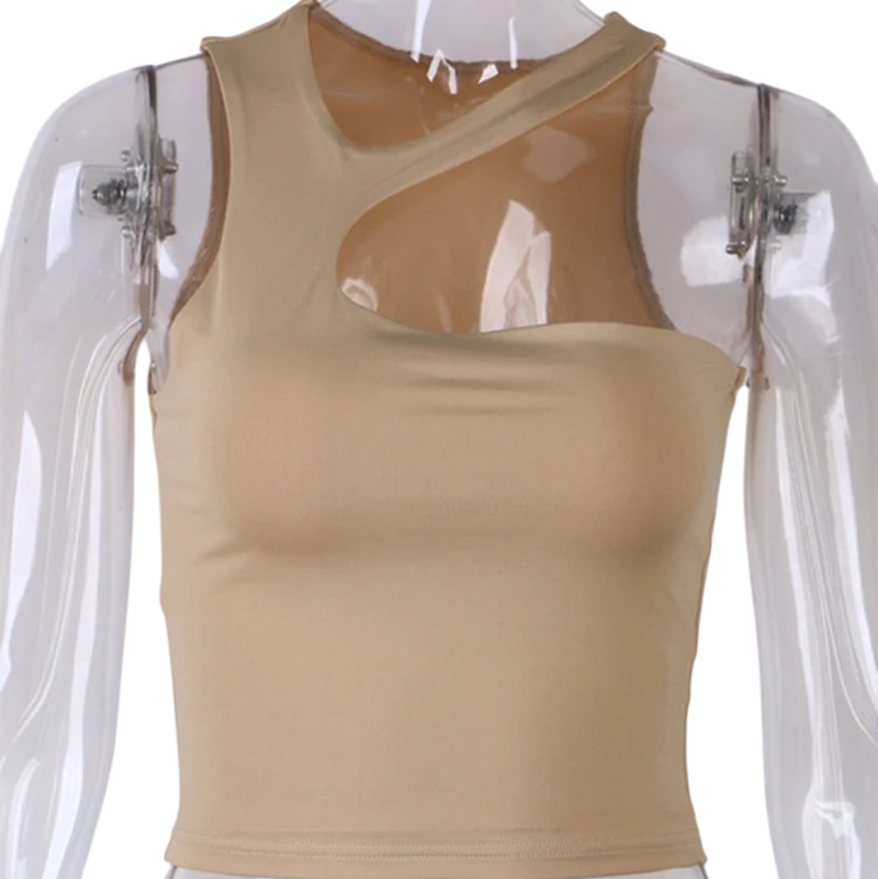Damskt enfärgat asymmetriskt crop top med O-urringning och breda axelband i polyester och bomull