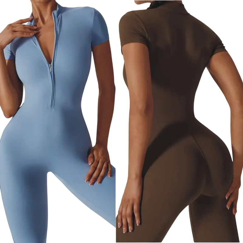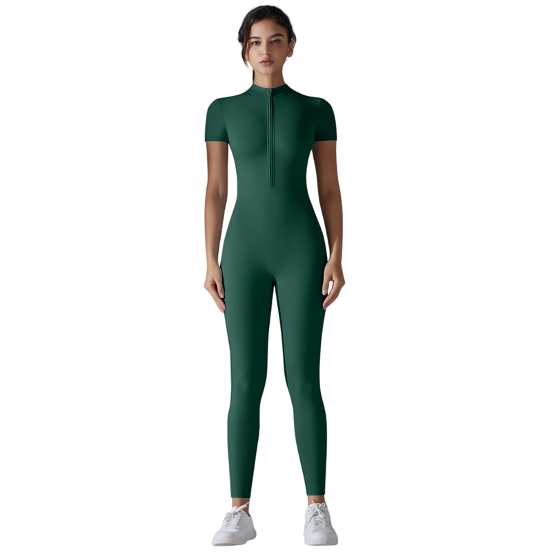 Damsportoverall med kort ärm är det perfekta valet för kvinnor som söker funktionella och bekväma sportkläder i modern design. Det tighta snittet framhäver figuren vackert och ger samtidigt maximal rörelsefrihet under träning. Kombinationen av nylon och spandex säkerställer hög elasticitet, lätthet och hållbarhet i materialet. Den praktiska dragkedjan i halsen gör det enkelt att ta på sig och möjliggör reglering av ventilationen under fysisk aktivitet. Overallen är lämplig för fitness, yoga, löpning och fritidsbruk.