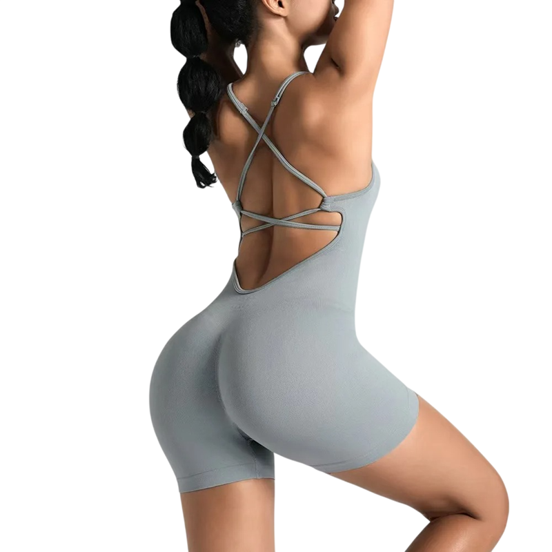 Lätt damsportoverall idealisk för fitness och sommarträning, elastiskt material med öppen rygg säkerställer komfort och maximal rörelsefrihet. Fullständig beskrivning