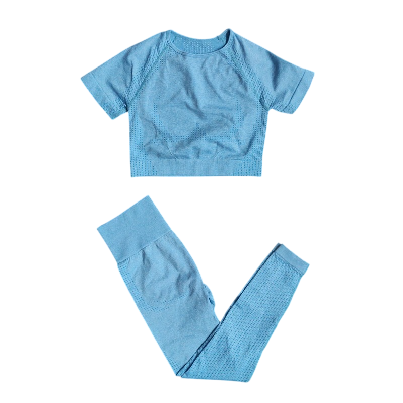 Detta damsportset är det perfekta valet för kvinnor som söker bekväma och funktionella kläder för vardaglig rörelse och sportaktiviteter. Kombinationen av leggings och t-shirt med kort ärm ger balanserad komfort, modern stil och tillräckligt med rörelsefrihet vid träning. Materialet, som består av en blandning av nylon, polyester och spandex, är lätt, elastiskt och behagligt mot huden. Den enfärgade designen ger en tidlös look och är lätt att kombinera med andra sporttillbehör.