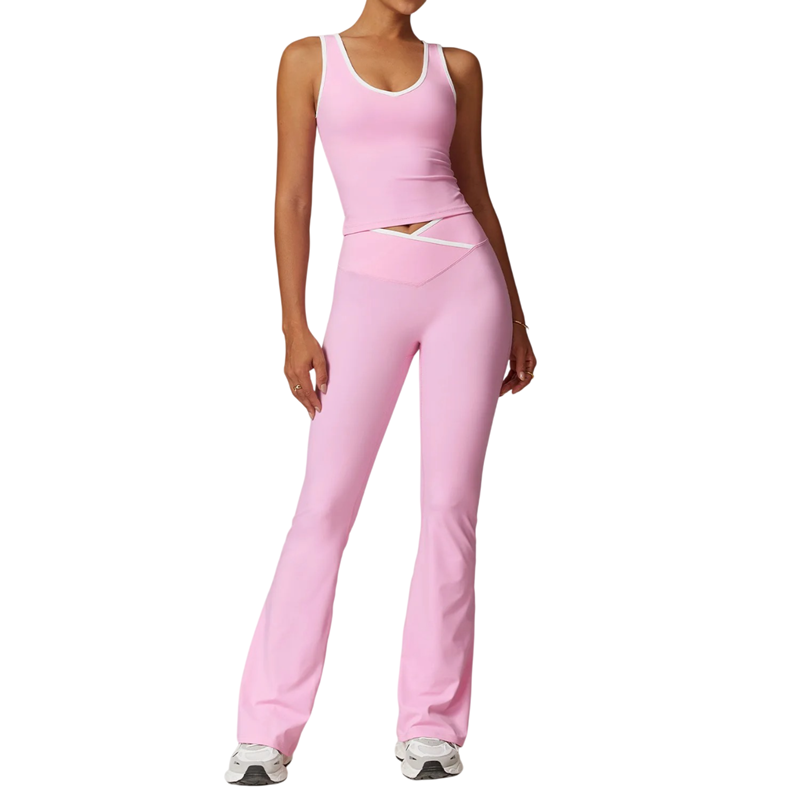 Damsportset med byxor och linne av nylon och spandex. Enkel design, idealisk för fitness, träning eller fritid, bekvämt och elastiskt material. Fullständig beskrivning