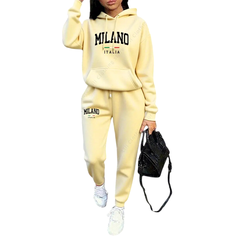 Damsset med byxor och hoodie med tryck "Milano", tillverkat av polyester. Perfekt för bekväm användning och modern stil. Fullständig beskrivning
