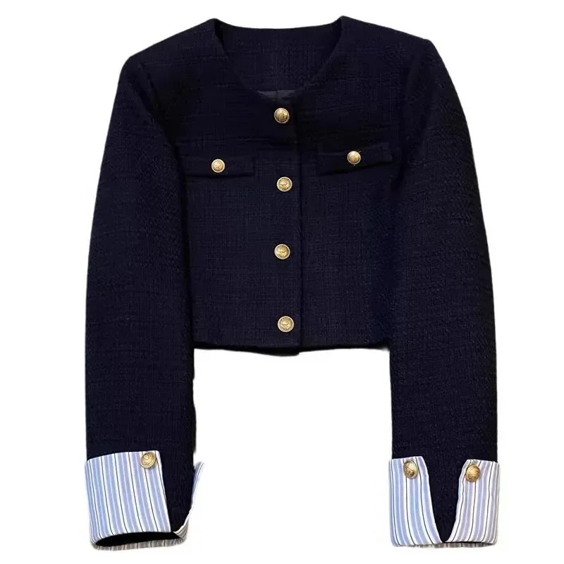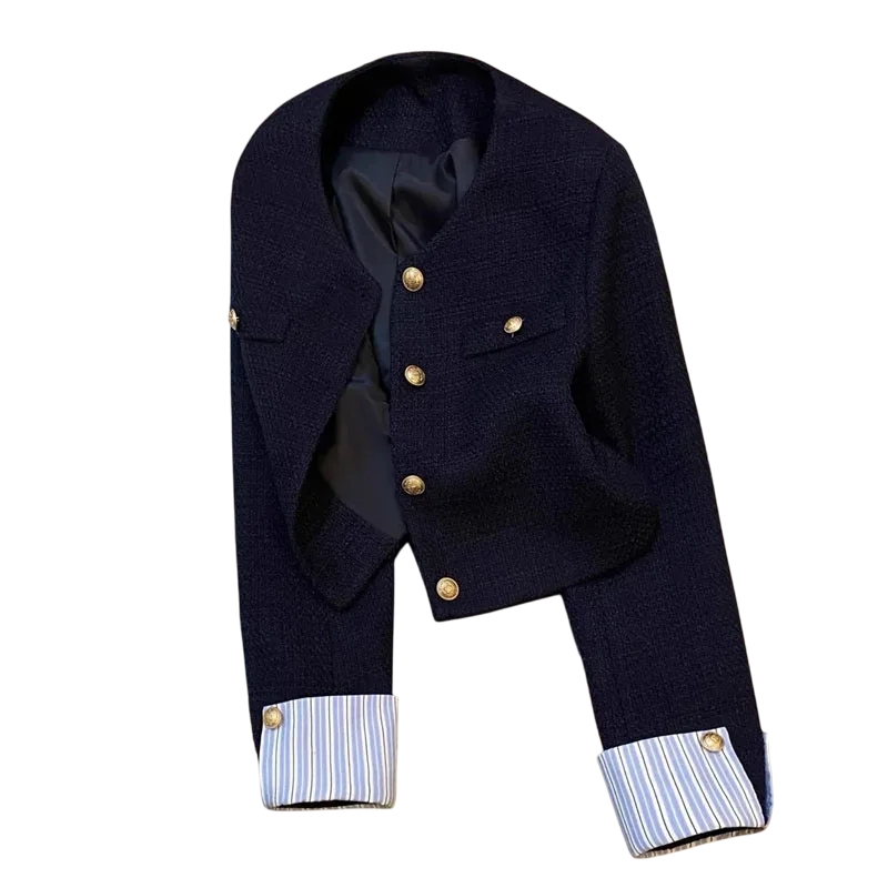 Startsida Startsida Kläder och accessoarer Damkläder Damkavajer Damsvart blå jacka med fickor och dekorativt ärmkant Elegant enfärgad jacka med knappar Bomull Polyester Spandex Akryl