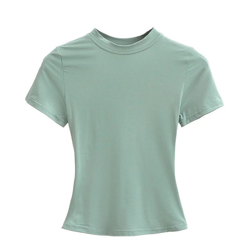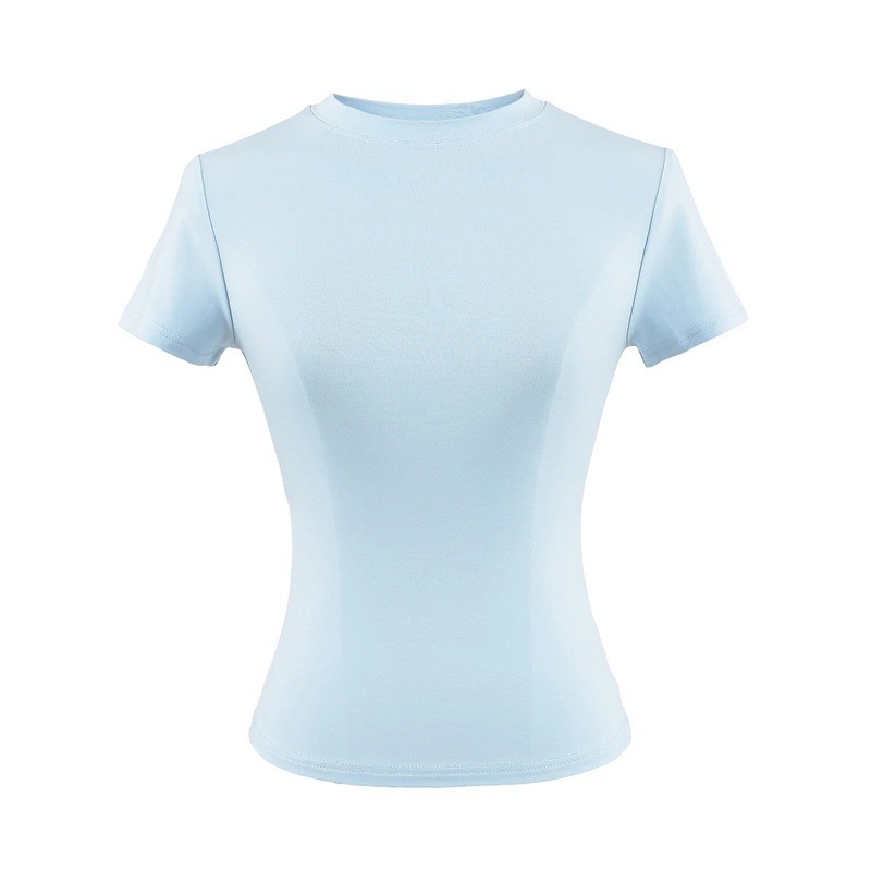 Denna åtsittande kortärmade T-shirt för kvinnor är det perfekta valet för kvinnor som föredrar en elegant men ändå bekväm stil. Tack vare den smala passformen följer den silhuetten perfekt och framhäver feminina kurvor. Den runda halsringningen ser ren och universell ut, så den passar till nästan allt. T-shirten är tillverkad av ett behagligt elastiskt material som är bekvämt att bära hela dagen lång. Den passar utmärkt till jeans, byxor, kjolar och jackor – kort sagt, ett basplagg i varje garderob.