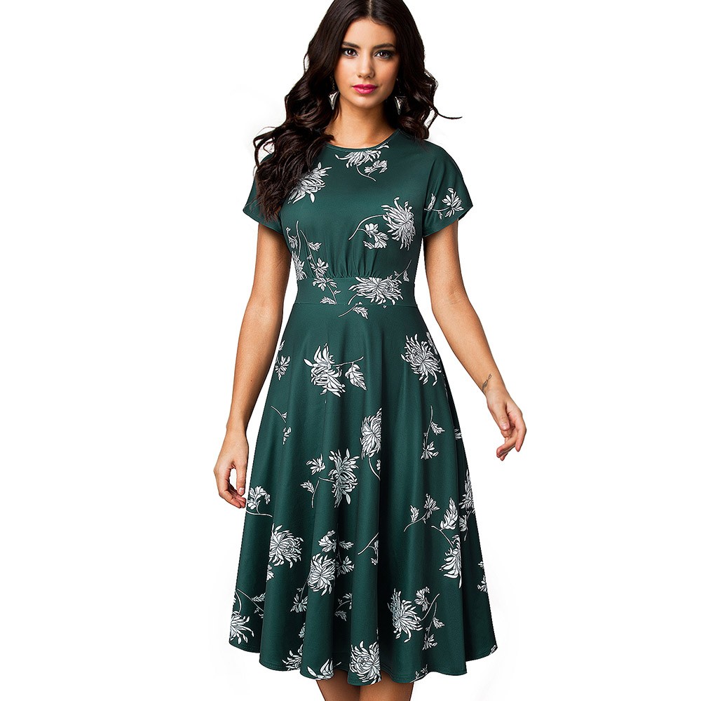 Elegant snitt, korta ärmar och en veckad kjol.
