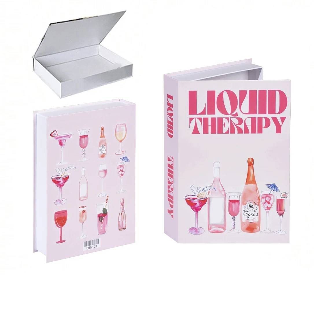 Denna falska bok är den perfekta kombinationen av nöje och praktiskhet. Med motiv av olika cocktails och drycker i pastellfärger är den idealisk för alla som älskar stiliga dekorationer. Texten "Liquid Therapy" gör den till en rolig och smakfull detalj för varje rum. Den öppningsbara designen möjliggör dold förvaringsutrymme, som är perfekt för att förvara små värdesaker eller personliga föremål. Vit omslag med illustrationer av glas och flaskor ger en fräsch atmosfär och modern look till ditt utrymme. Denna produkt kommer att se fantastisk ut på soffbordet, hyllan eller i bokhyllan, där den tillför en touch av stil till din inredning.