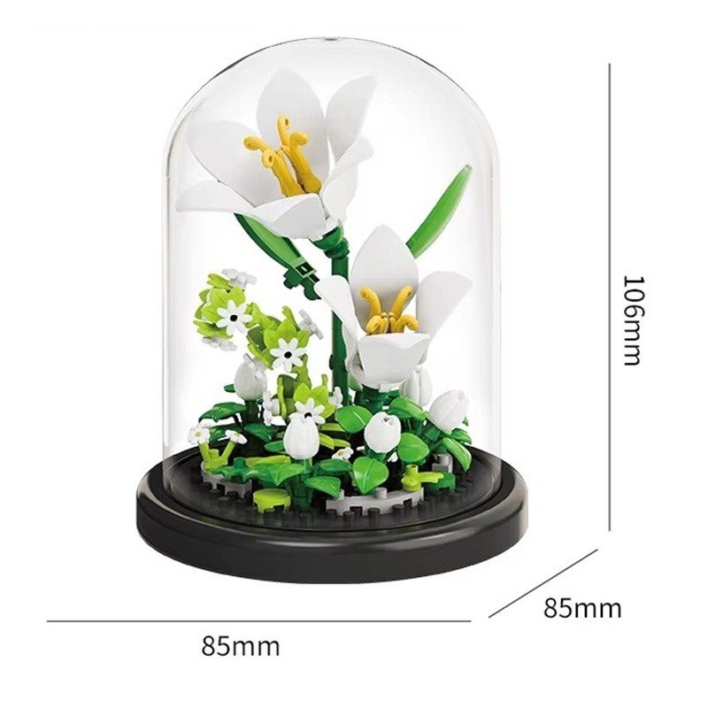 Elegant mikrobyggsats av vita liljor i kruka och genomskinlig låda fungerar som en vacker dekoration, kreativ underhållning och en fin present för barn och vuxna. Fullständig beskrivning