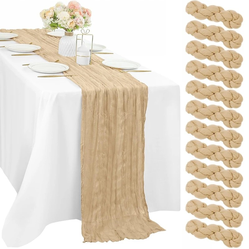 Denna dekorativa duk av linne är en lämplig komplettering för borddekorationer vid olika festliga tillfällen. Tack vare måtten 90 × 180 cm kan den användas självständigt eller som en löpare över en annan duk. Rustik lantlig stil passar för bröllopsdekorationer såväl som temafester. Den lätta gasstrukturen ger ett naturligt utseende som kan komplettera festlig dukning av bord.