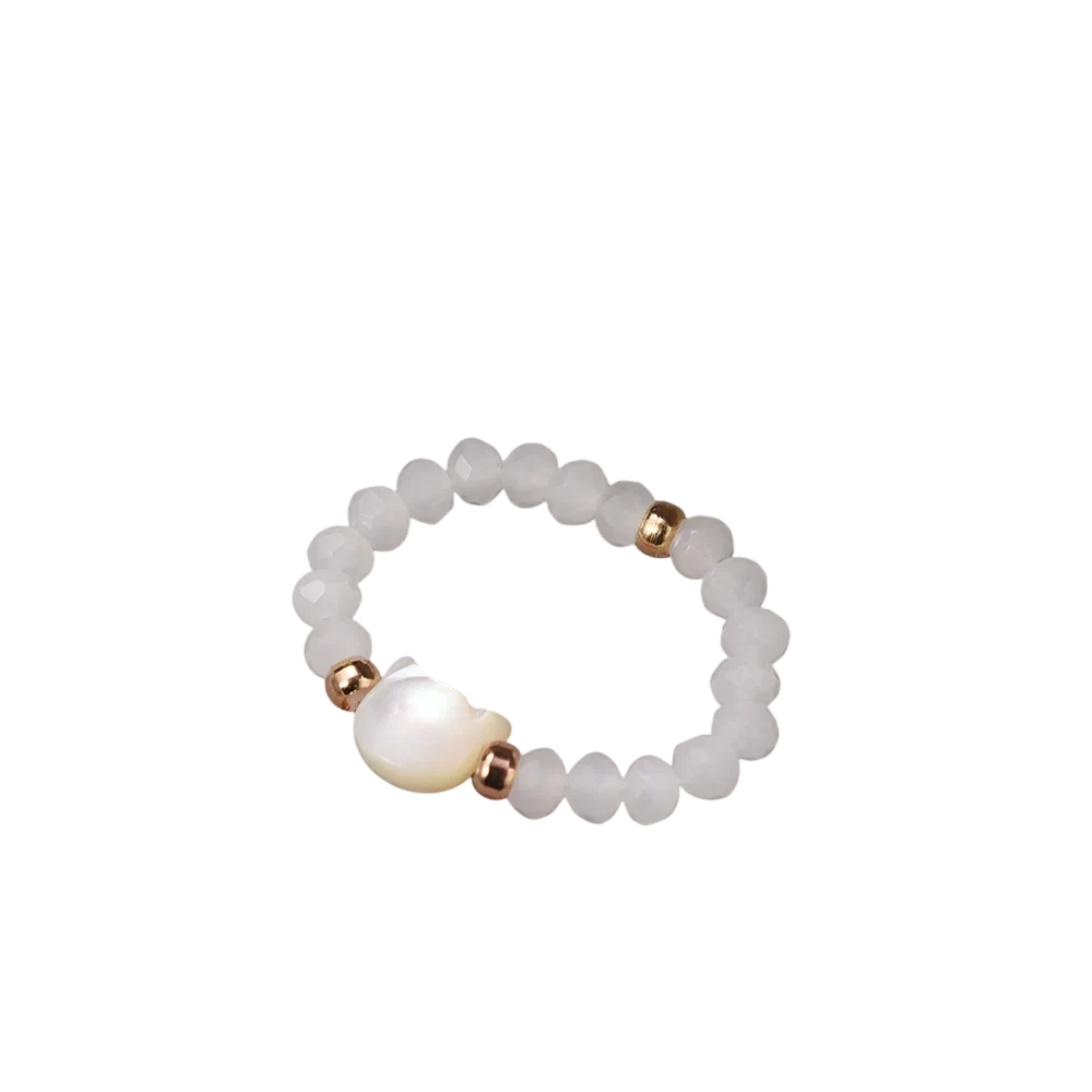 Ringen består av små pärlor med pärldiameter 1,8 mm, vilket ger lätthet och en behaglig känsla vid användning. Det mest framträdande inslaget är kattmotivet av månsten, som är populärt för sin mjuka glans och intressanta utseende. Materialkombinationen inkluderar också kombinationen av resin och konstgjord snäcka, vilket ger smycket en unik färgeffekt och lång hållbarhet. Tack vare sin elasticitet erbjuder den universell storlek, vilket gör den lämplig som present utan att behöva fundera på exakta mått.