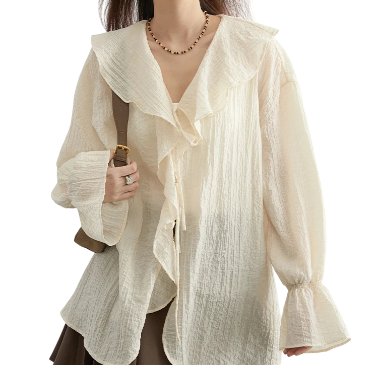 Elegant blus för kvinnor med volanger och krage Enfärgad skjorta med lång ärm Snörning med band Stilig topp i nylon och lyocell