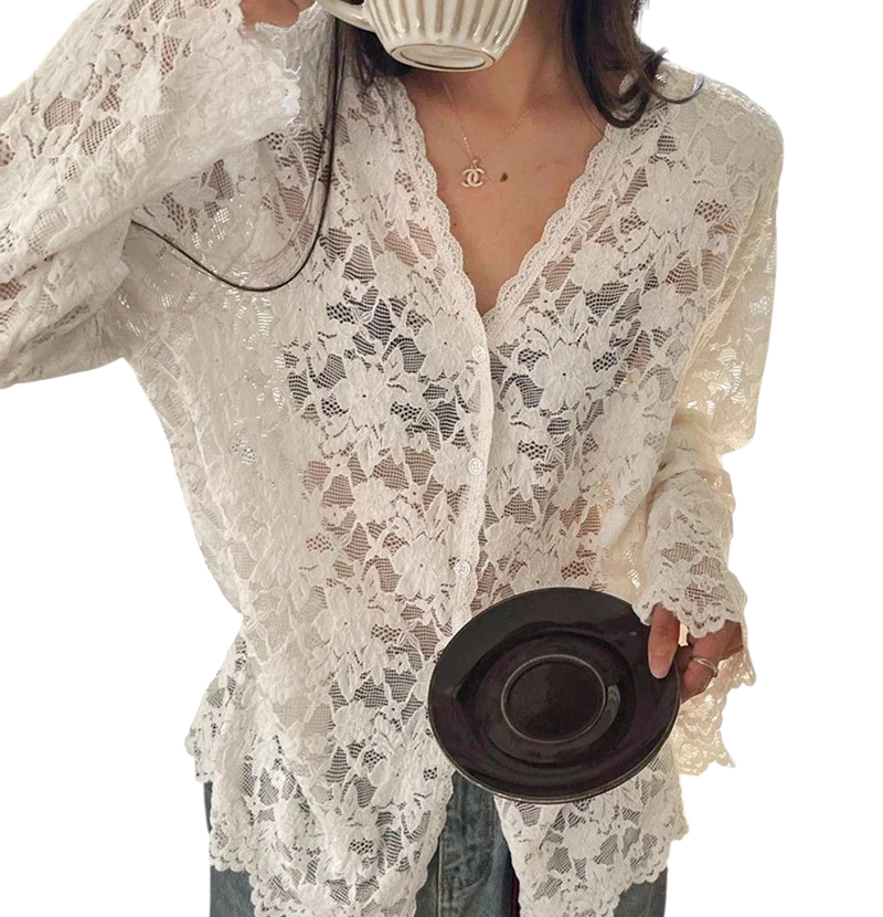 Startsida Startsida Kläder och accessoarer Damkläder Damskjortor Damfritidsskjortor Elegant blus med lång ärm i spets för damer Genomskinlig blus med V-ringning och knappstängning Enfärgad topp i polyester