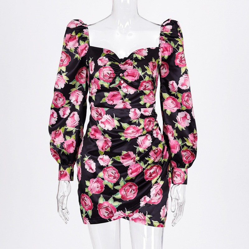 Lyxig miniklänning för kvinnor med asymmetrisk kjol och stor urringning.