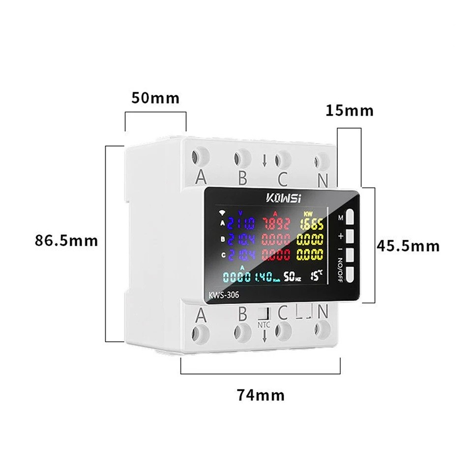 Startsida Startsida Hobby och trädgård Mätinstrument Energimätare och nätverksskydd AC 85–290 V 80 A 3-fas 4 ledare DIN-skena KWS-306 utan Wi-Fi Överspänning Underspänning Överbelastning