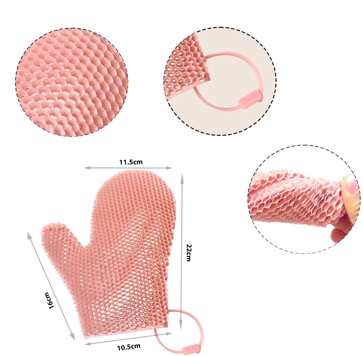 Den praktiska designen av handsken uppskattas av användare som söker ett enkelt och funktionellt tillbehör för personlig hygien. Den elastiska strukturen möjliggör jämnt tryck vid rengöring utan behov av ytterligare hjälpmedel. Ytan på handsken är utformad för att vara lätt att rengöra och snabbt redo för nästa användning. Tack vare den universella storleken är den lämplig för de flesta användare. Användningen av handsken är intuitiv och kräver inget komplicerat tillbehör.