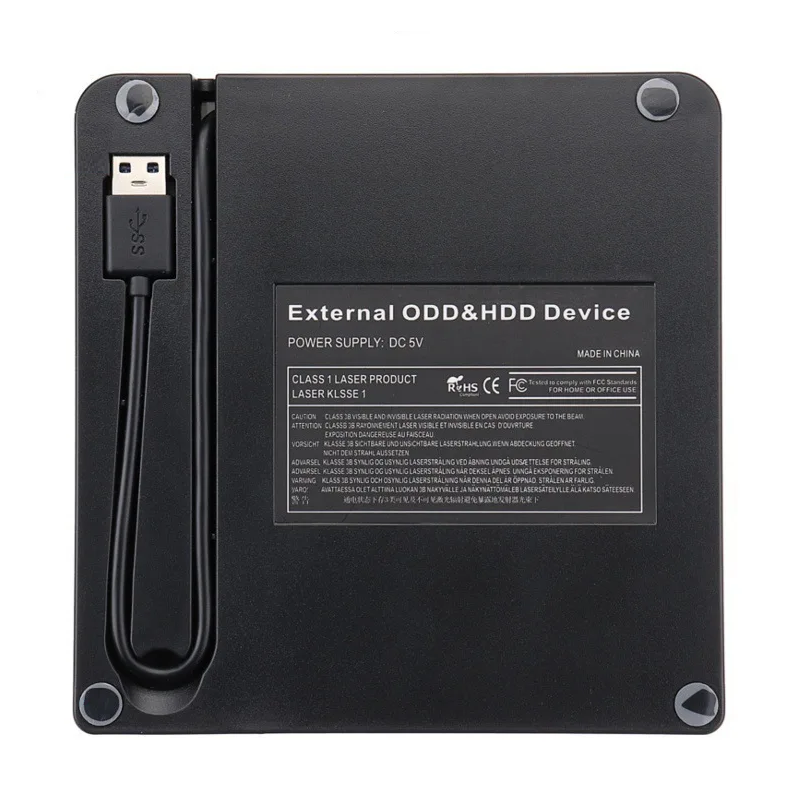 Extern CD/DVD-enhet 13,8 x 14,2 x 1,8 cm USB 3.0 kortplats för SD och TF-kort Plug and Play brännare med extern strömförsörjning 20 cm kabel