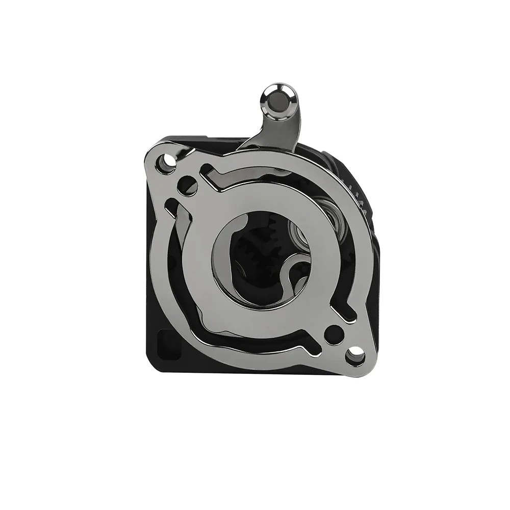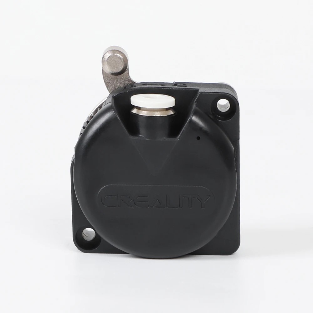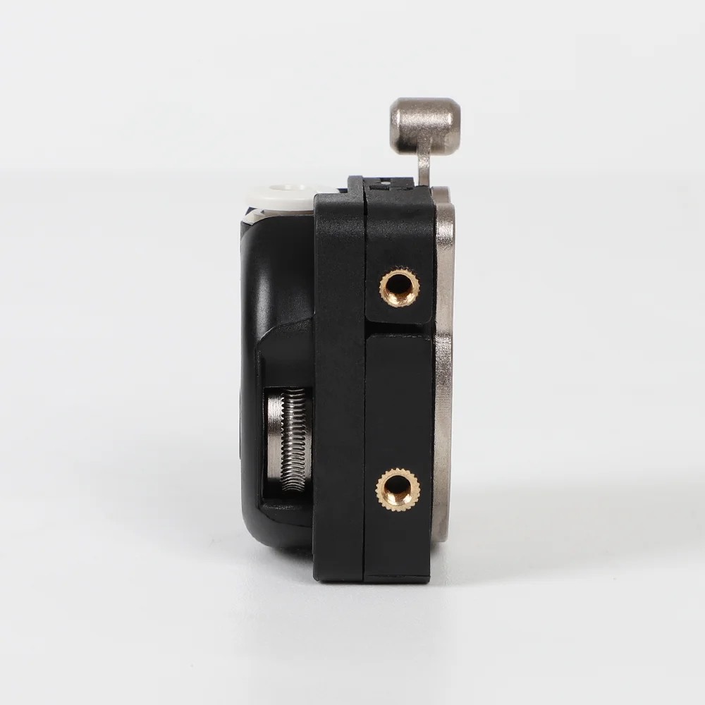 Inuti mekanismen finns ett par exakt bearbetade matningshjul med fin tandning. Denna konstruktion säkerställer ett fast grepp om filamentet utan att deformera det och garanterar en konsekvent förflyttning även med material som kräver hög precision. Hela den inre delen är designad för att vara slät, utan vassa kanter, så att filamentet inte möter hinder under styrningen. Tryckspaken med metallarm möjliggör enkel frigöring av filamentet vid byte, utan risk för skador på delen eller överdrivet tryck. Detta gör att hanteringen är snabb, enkel och bekväm även vid frekvent materialbyte.