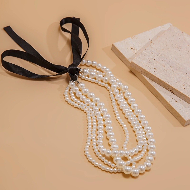 Startsida Startsida Smycken och klockor Damsmycken och klockor Damchokers Flerlagig pärlchoker 36 cm med svart rosett, elegant stängning