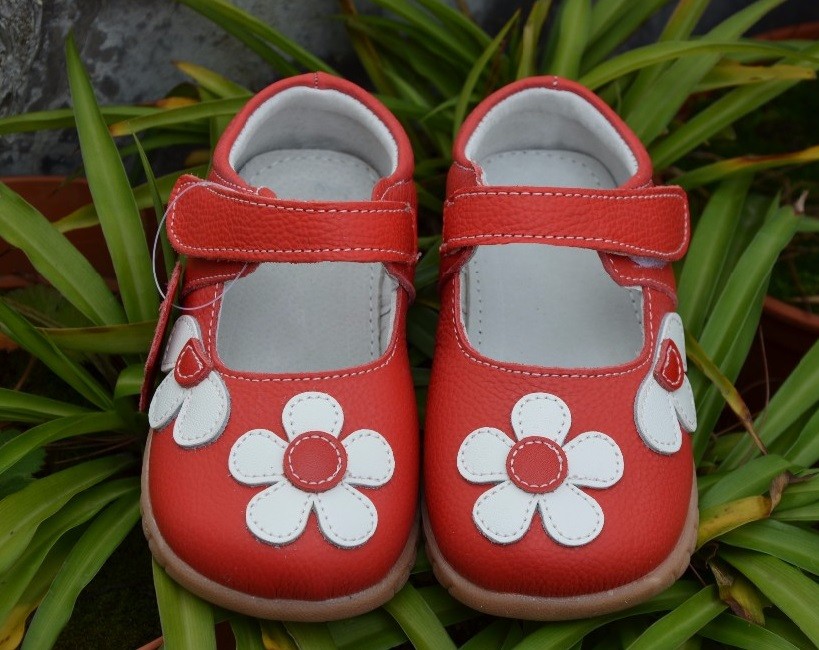 Flickballerinor med blommor är lämpliga skor för deras första steg.