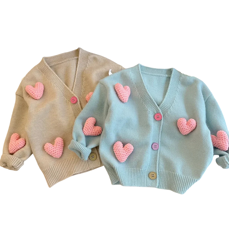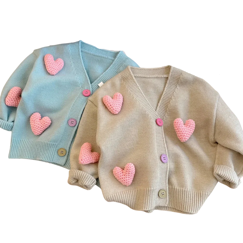 Söt flickors stickad cardigan med hjärtan och V-ringning, tillverkad av mjuk bomull och polyester, perfekt för höst och vinter. Fullständig beskrivning