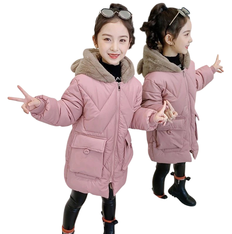 Startsida Startsida Kläder och accessoarer Barnkläder Flickkläder Flickjackor, kappor och västar Flickvinterjackor Flickors vinterjacka Dragkedja Fickor för händer Huva med päls och öron Enfärgad varm vinterjacka Bomull Polyester Varm bekväm passform