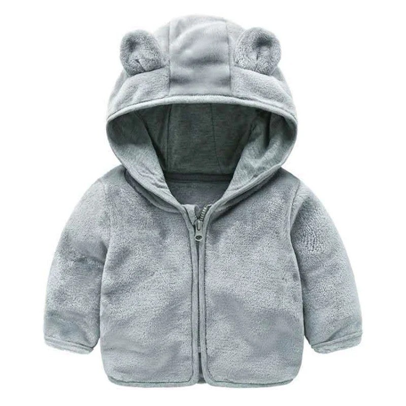 Söt flickors vinterjacka i plyschmaterial med huva med öron och dragkedja. Värmande bomull-polyesterutförande som är perfekt för vinterdagar. Fullständig beskrivning