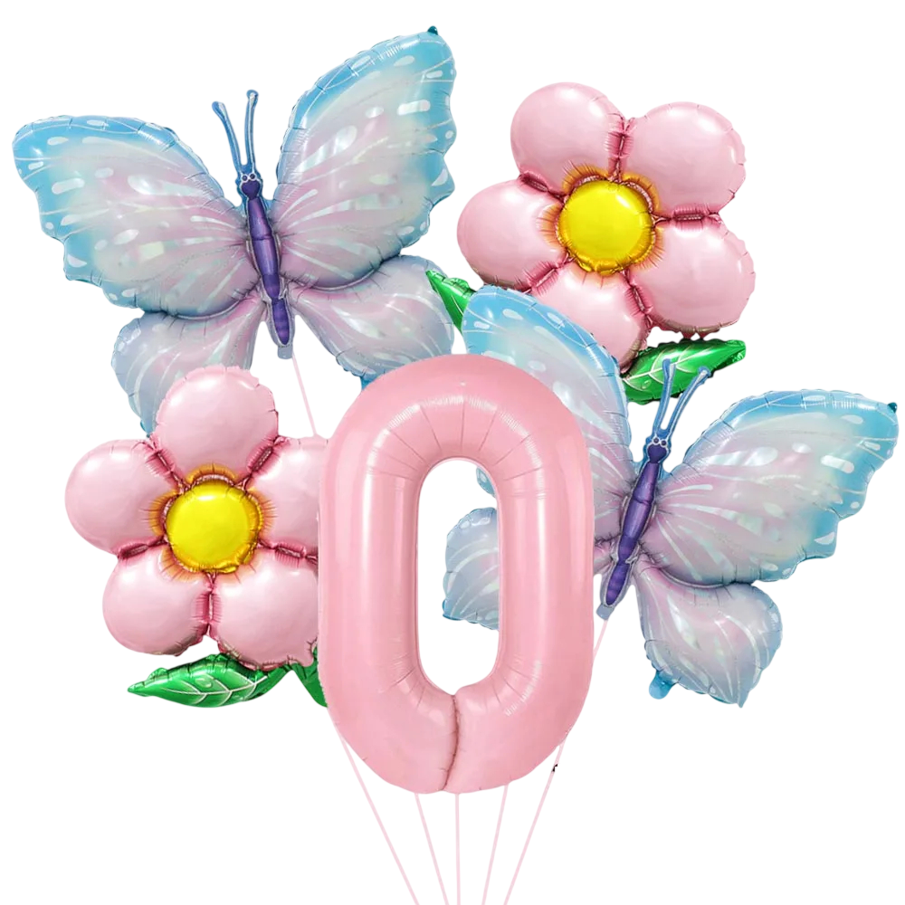 Detta set med foliärballonger med nummer 0 är lämpligt som dekoration för en födelsedagsfest eller annan festlig utsmyckning. I förpackningen finns motiv av blommor, fjärilar och en stor ballong i form av ett nummer, vilket ger en enhetlig och väl framträdande look i fotohörnet såväl som vid festbordet. Den dominerande delen av setet är ballong nummer 0 med en storlek av 81,3 cm, som kompletteras av blommor och fjärilar i mjuka pastellnyanser. På bilden syns en kombination av rosa, blått, gult, grönt och lila, vilket gör att dekorationen passar olika feststilar. De mindre blommiga ballongerna har en storlek av 45,7 cm och fjärilarna enligt bilden är ungefär 98 × 72 cm.