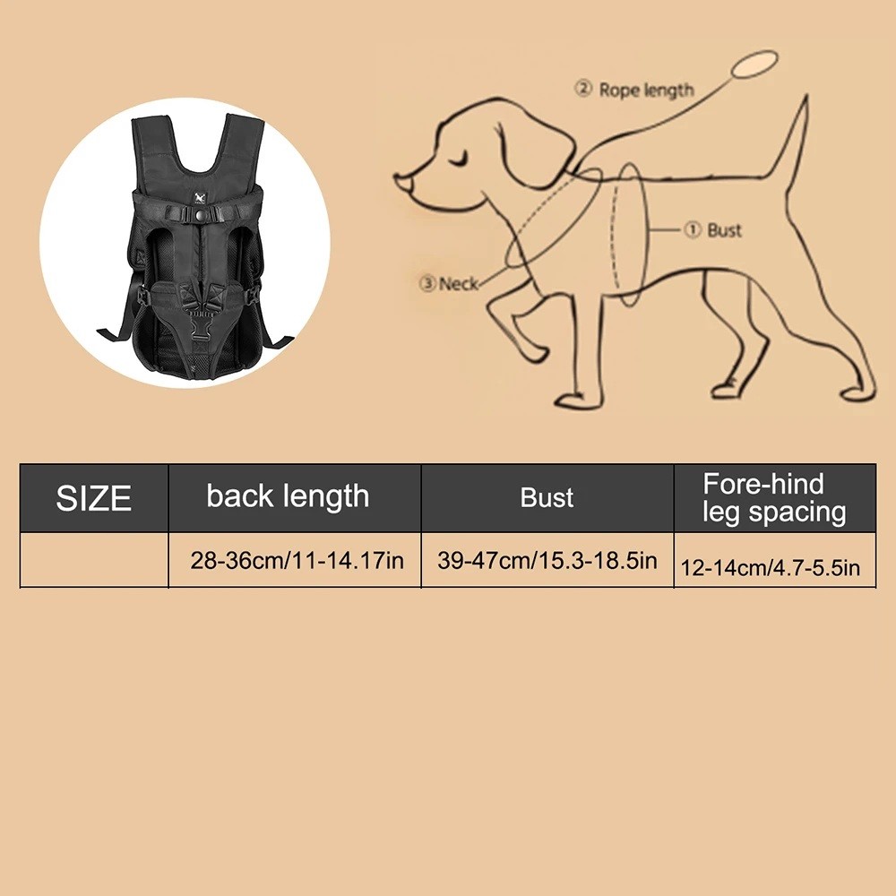 Denna bärare är idealisk för små och medelstora hundar och passar även för andra husdjur som du gärna bär med dig. Lämplig för berg, camping och till staden. Om du är osäker på att välja rätt storlek rekommenderar vi att du mäter rygglängden, bröstomfånget och avståndet mellan framben och bakben enligt storlekstabellen.