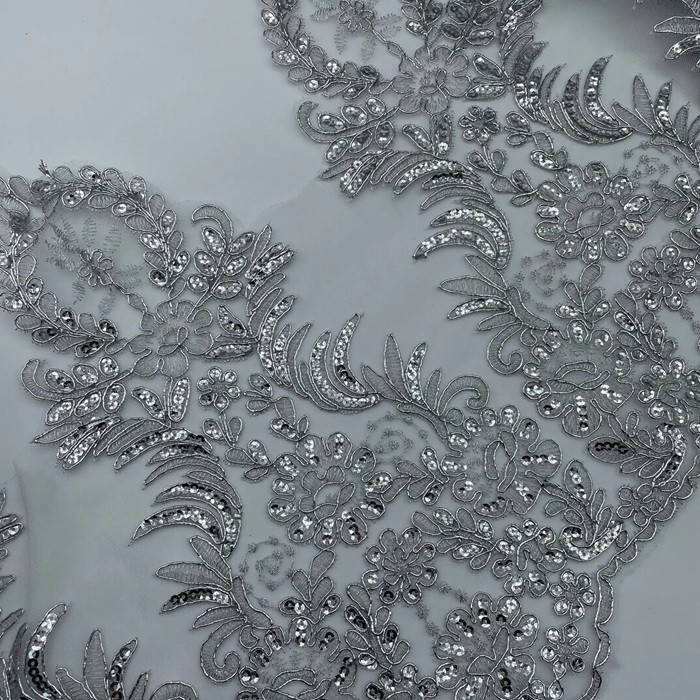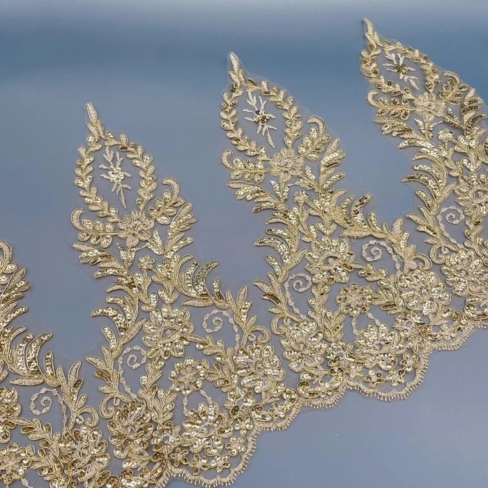 Glittrande dekorativt tyg med paljetter och spetskant är perfekt för sömnad, skapande av kostymer, dekoration av kläder och kreativa DIY-projekt. Fullständig beskrivning