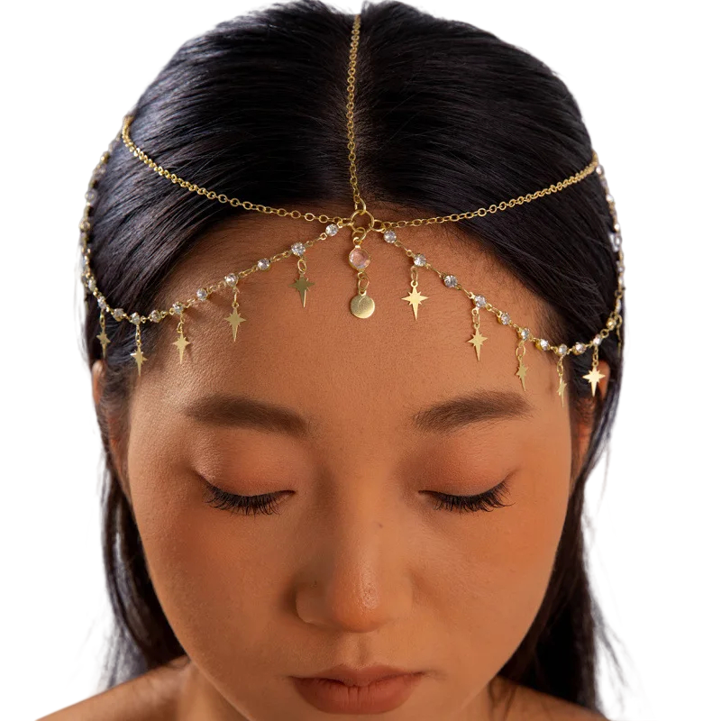 Guldkedjan för huvudet är ett originellt hårsmycke som ger frisyren en elegant och framträdande look. Det fina utförandet med motiv av kometer och glittrande stenar skapar en unik dekorativ effekt inspirerad av stjärnhimlen. Prydnaden framstår som lätt och samtidigt lyxig, vilket gör att den vackert kompletterar olika typer av frisyrer. Den stiliga utformningen möjliggör enkel matchning med både festliga och mer framträdande looks.