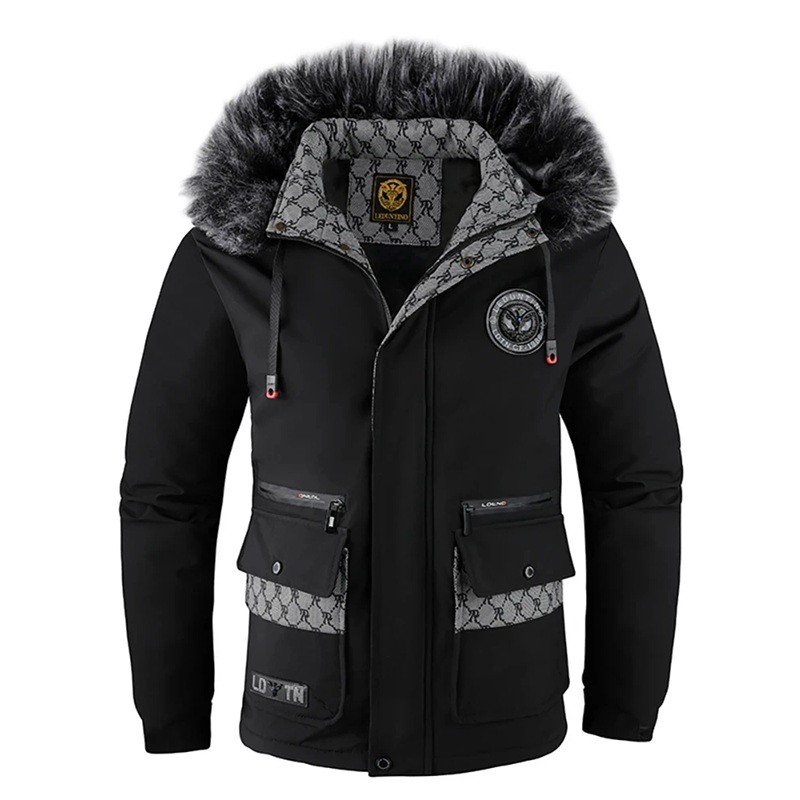 Stilig herr vinter bomull jacka med huva och fuskpäls, vindavvisande och vadderad, med fickor och dragkedja, perfekt för kalla höst- och vinterdagar, tillgänglig i olika färger. Fullständig beskrivning