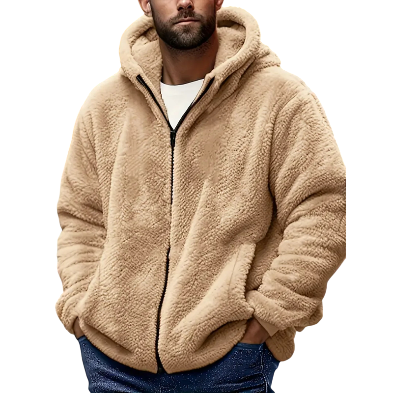 Varm herr vinterjacka i plyschpolyester med hög krage, fickor och dragkedja. Bekväm mjuk design lämplig för vardagligt bruk under kalla perioder. Fullständig beskrivning